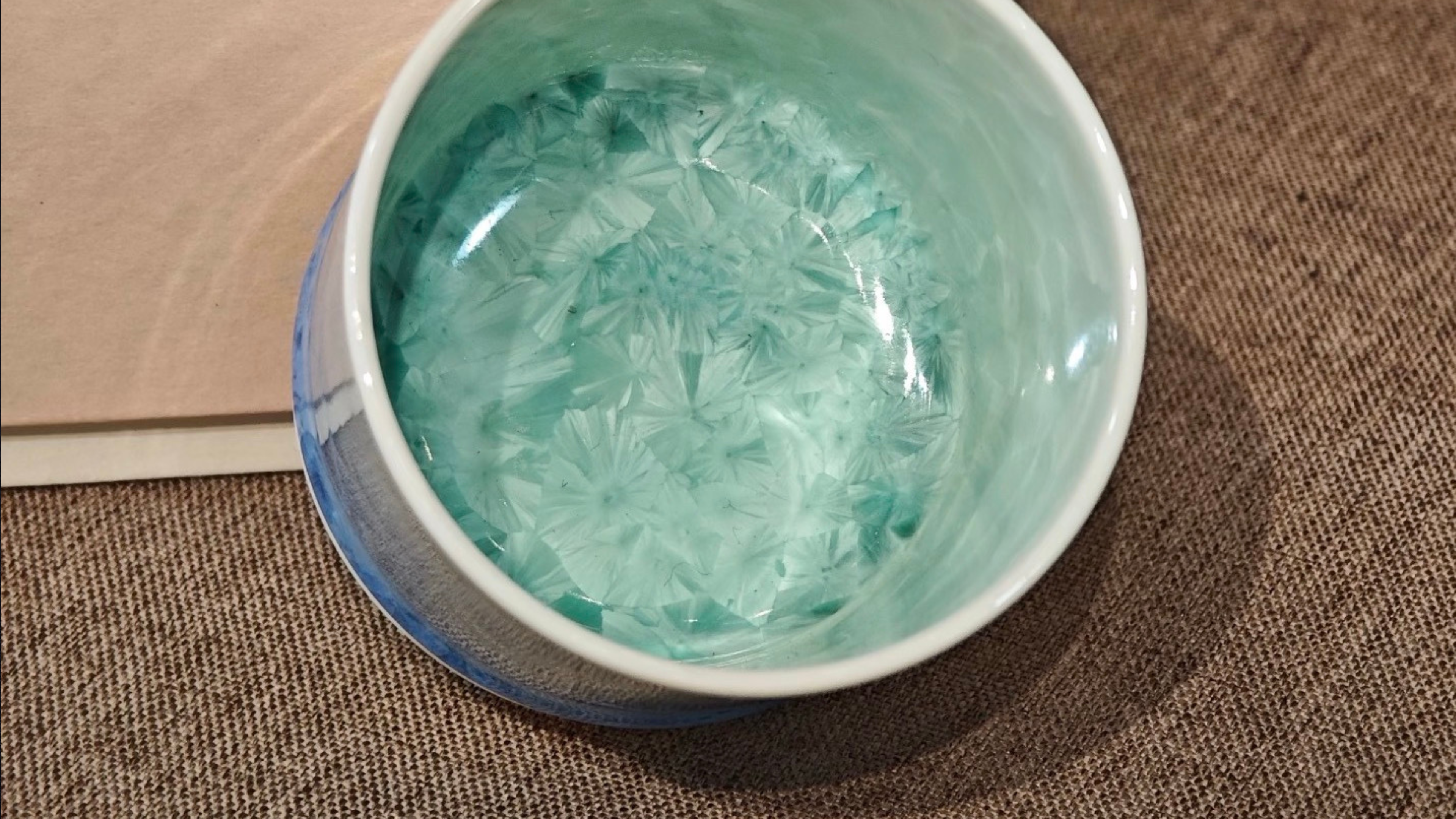 No. The patterns you see are natural mineral growths. During the cooling stage in the kiln, we hold the temperature at a specific point to allow zinc-silicate to crystallize. It is a biological-like growth process that happens entirely within the molten glaze.